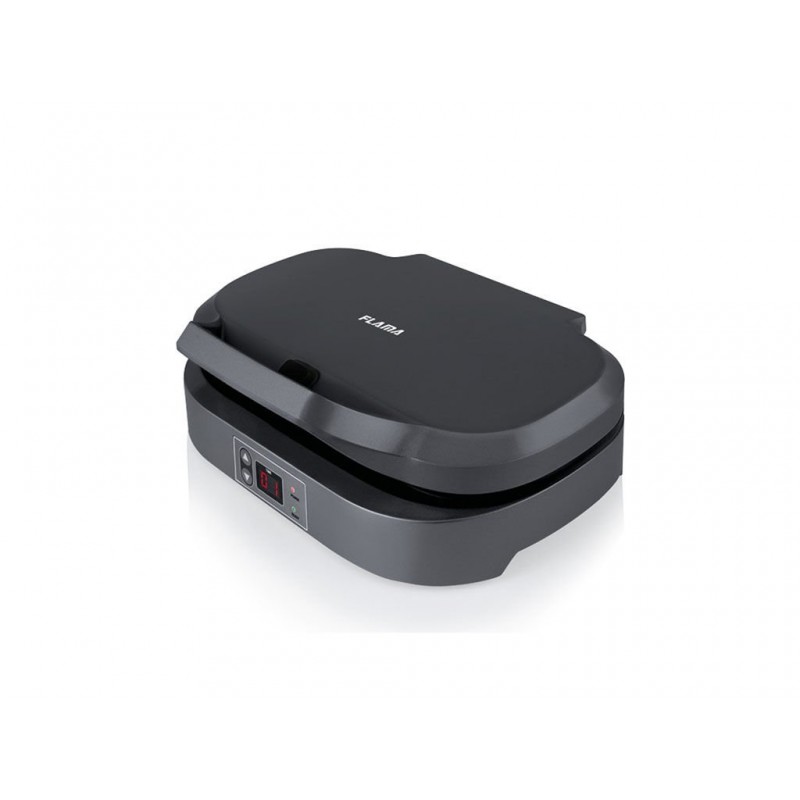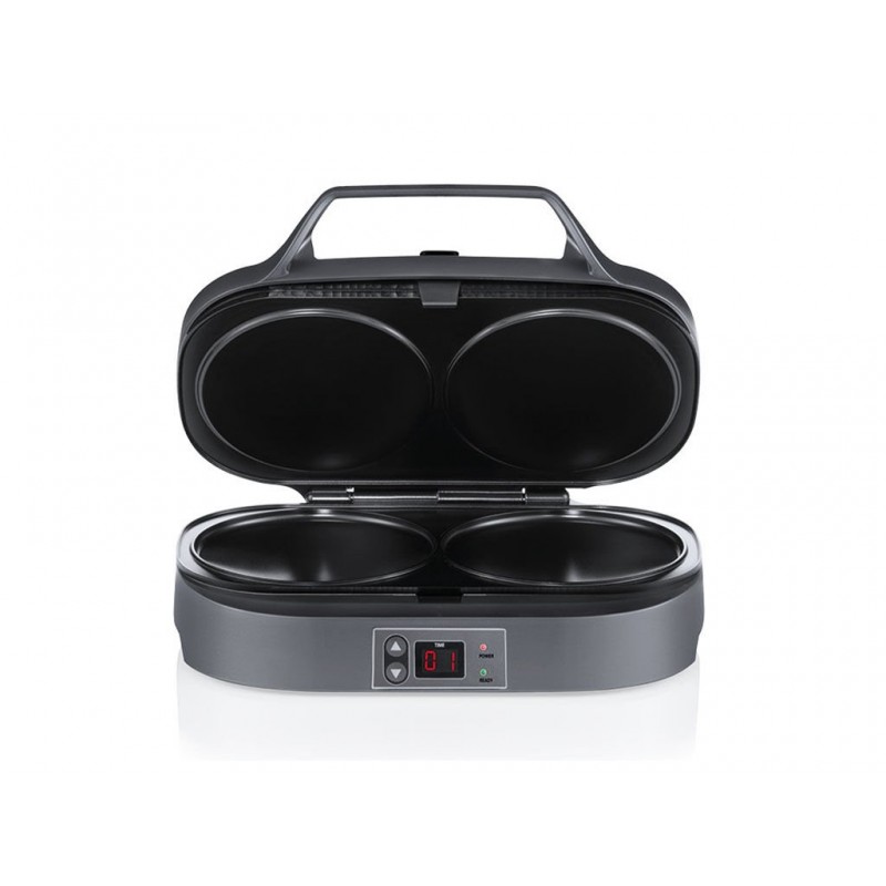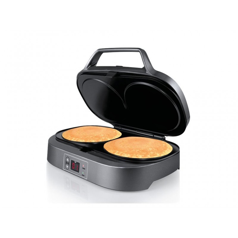 A máquina de panquecas e snacks 4902FL tem uma potência máxima de 1300 W, 2 concavidades para panquecas ou snacks e placas fixas antiaderentes.